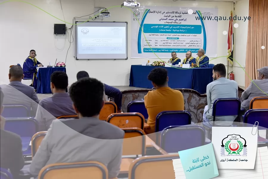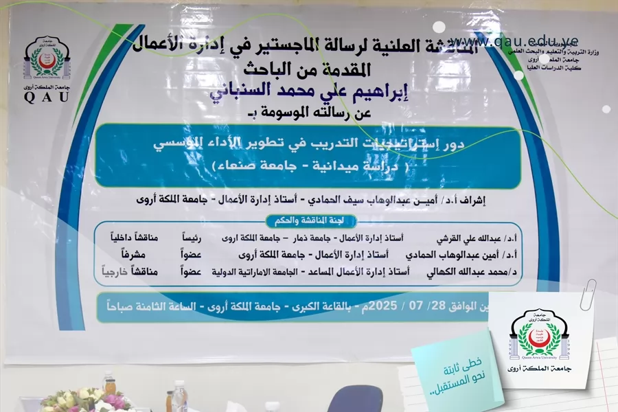 أقيمت صباح يوم الإثنين 28 يوليو 2025م المناقشة العلنية لرسالة الماجستير المقدمة من الطالب/ إبراهيم علي محمد السنباني والموسومة بـ دور إستراتيجيات التدريب في تطوير الأداء المؤسسي (دراسة ميدانية - جامعة صنعاء) وتمت مناقشة الرسالة من قبل اللجنة العلمية التي تكونت من: