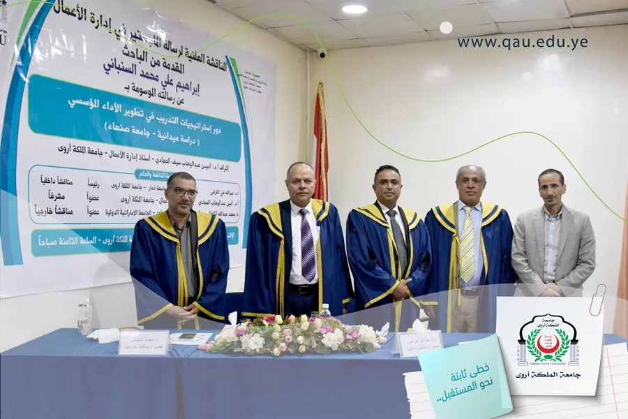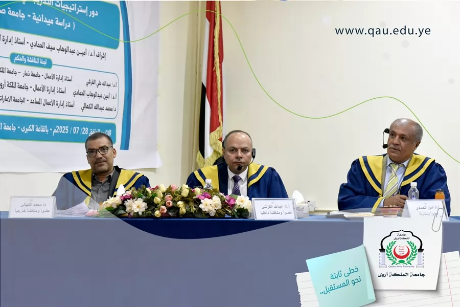 الأستاذ الدكتور/ عبدالله علي القرشي - أستاذ إدارة الأعمال - جامعة ذمار - جامعة الملكة أروى - رئيساً ومناقشاً داخلياً
