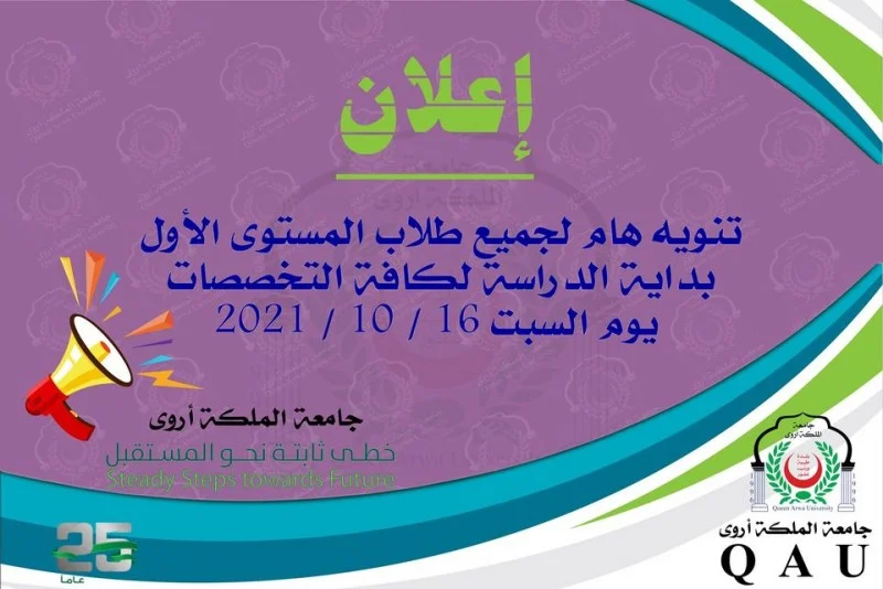 تنويه هام اعزائنا منتسبي جامعة الملكة أروى نود التنوية الى ان موعد بدء الفصل الدراسي الأول للعام الجامعي 2021 / 2022 م لطلاب المستوى الدراسي الاول - جميع التخصصات سيكون بمشيئة الله ابتداءَ من يوم السبت الموافق 16 / 10 / 2021 م ولمتابعة آخر الأنشطة والفعاليات يمكنكم متابعة حسابات الجامعة الرسمية على مواقع التواصل الاجتماعي. #Telegram: https://www.telegram.me/QueenArwaUniv #Facebook:https://www.facebook.com/queenarwauniv #Twitter:https://www.twitter.com/queenarwauniv #YouTube:https://www.youtube.com/#/c/queenarwauniv #Instagram:https://www.instagram.com/QueenUArwaUniv للإستفسار والتسجيل العنوان/ شارع الستين الجنوبي - فج عطان - مقابل شركة الأحول #Tel : +9671450121 ، +9671445992 #fax: 01445996 #Mobile number :+967770445995 #Pox :11586 #WhatsApp: +9671450121 , +967770445995 #جامعة_الملكة_أروى خطى ثابتة نحو المستقبل #queen_arwa_university Steady steps towards future