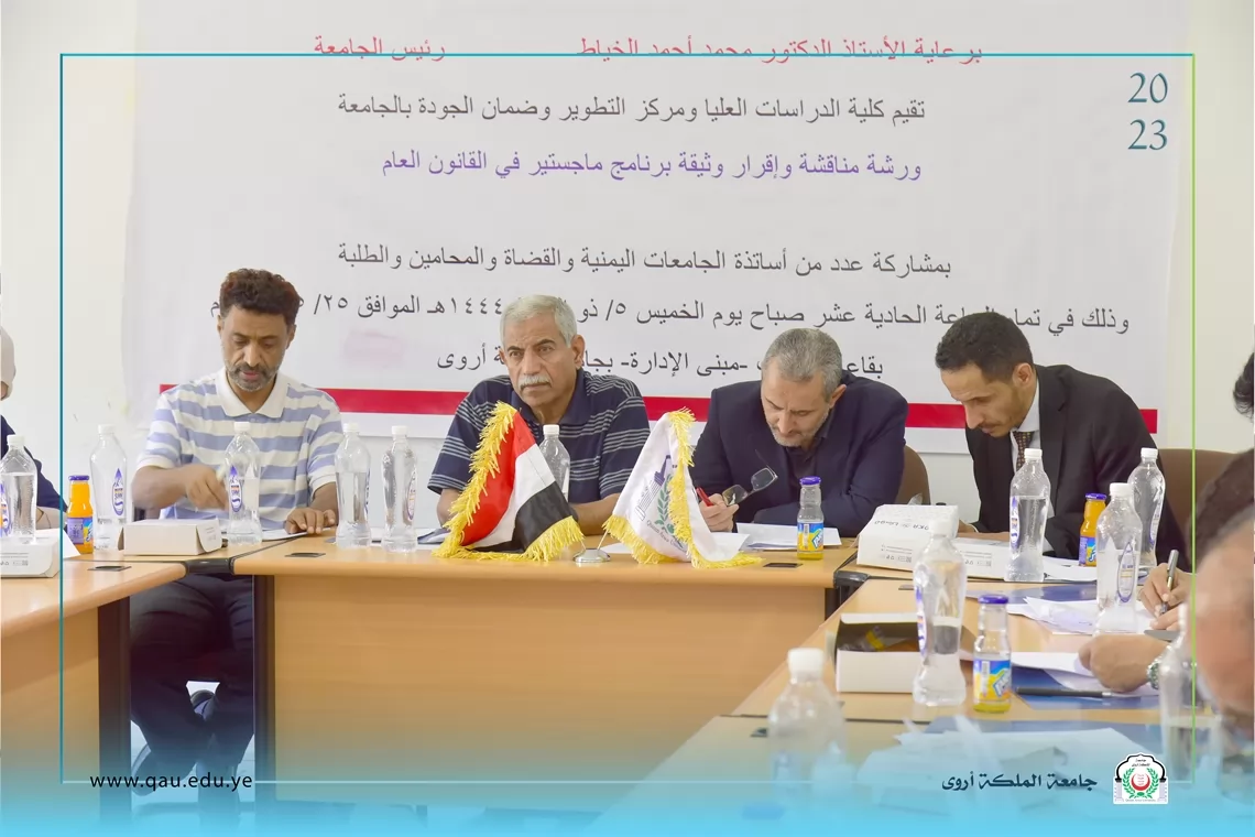 جامعة الملكة أروى تنظم ورشتي عمل لمناقشة وإقرار وثيقة توصيف برنامج الماجستير في القانون الخاص والعام