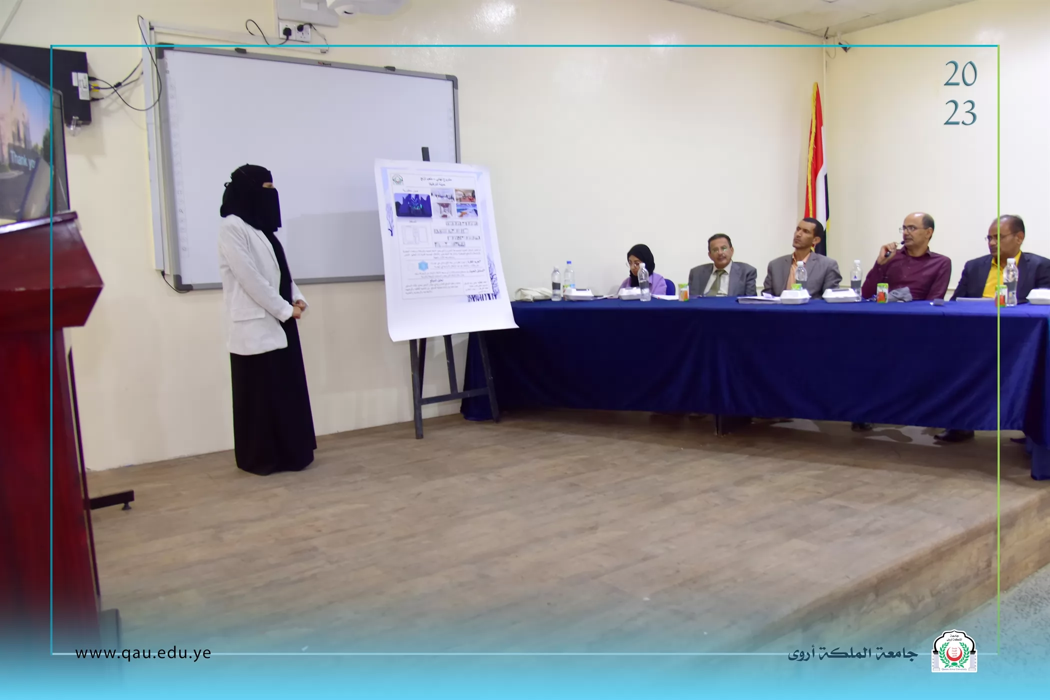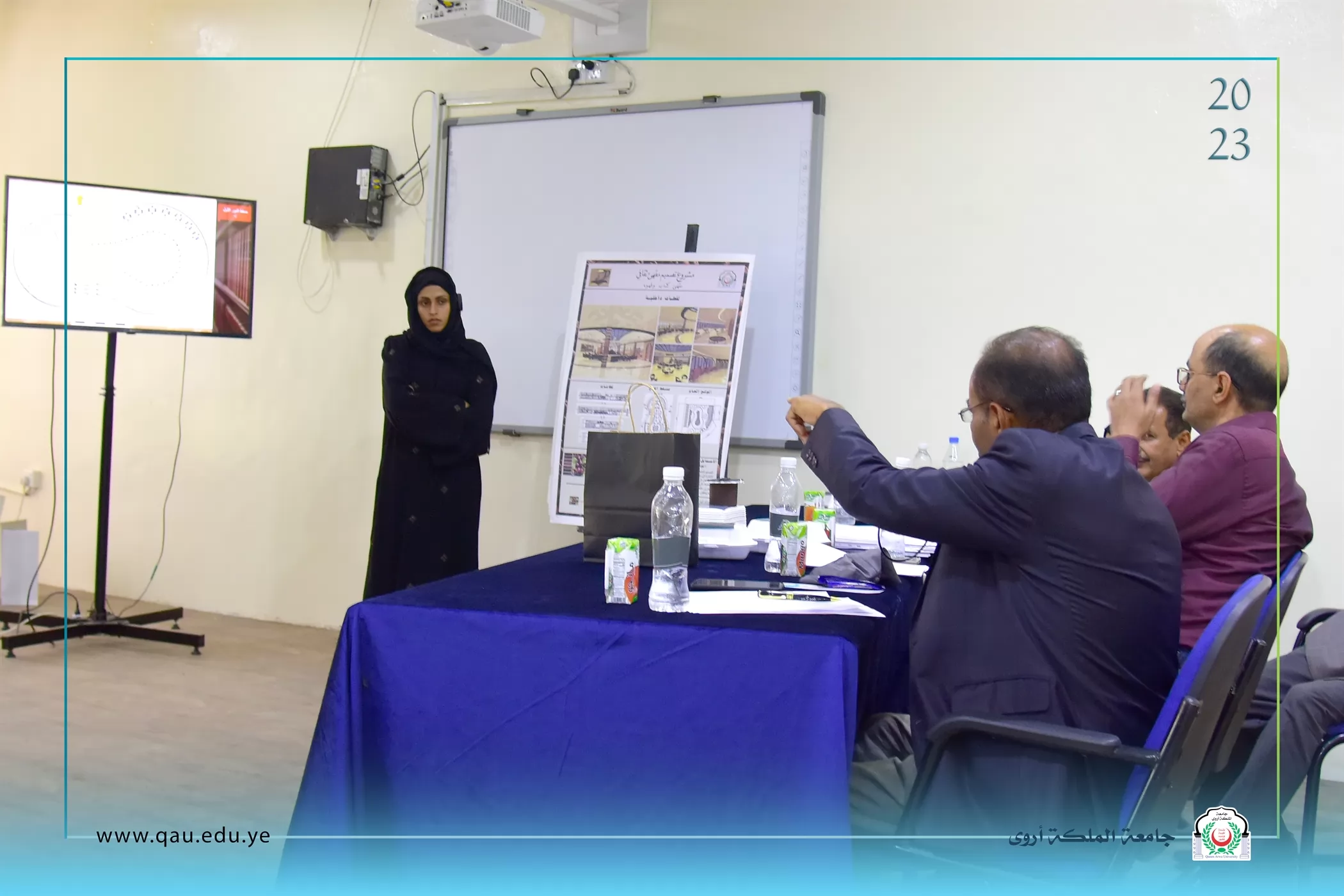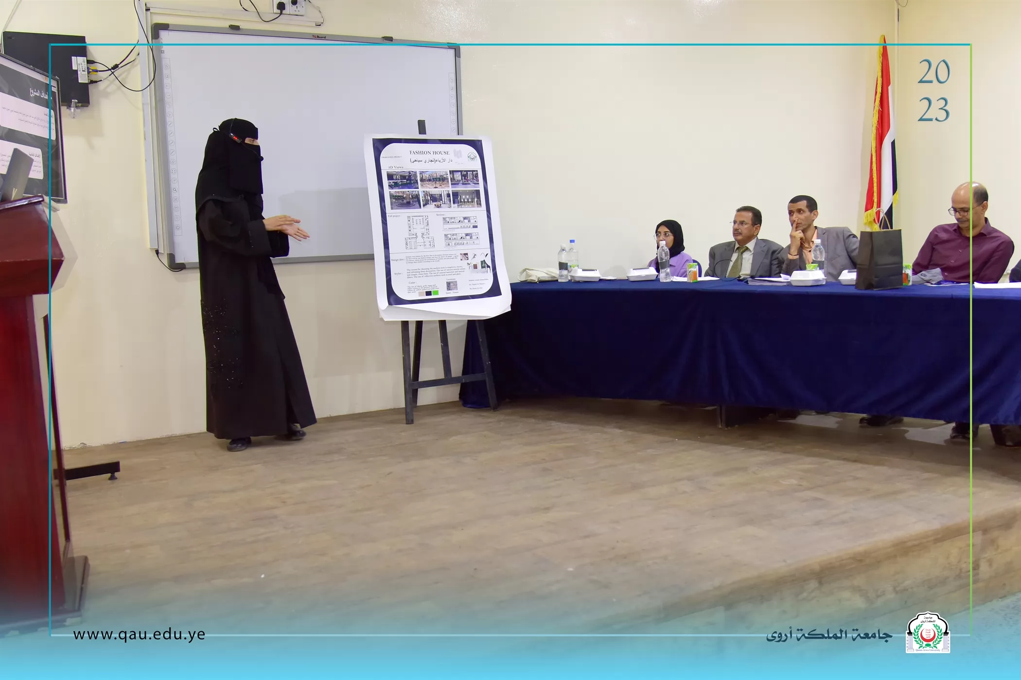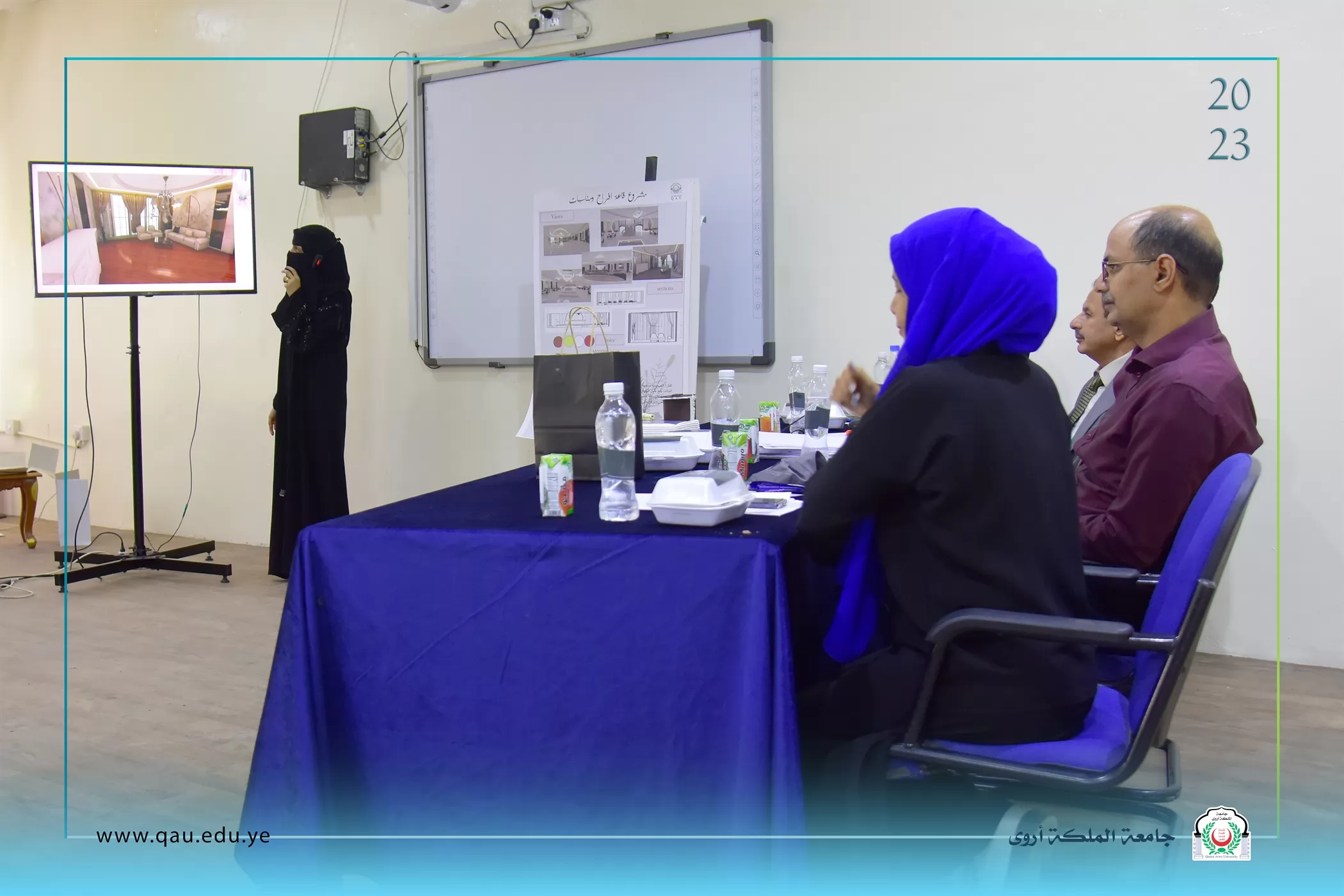 عُقدت بالقاعة الكبرى بجامعة الملكة أروى، جلسة مناقشة مشاريع تخرج طلبة المستوى الرابع قسم الفنون الجميلة/تصميم داخلي، وذلك بحضور الدكتور/ عبد الملك سيف الصلوي - عميد الكلية، وقد تكونت لجنة المناقشة والتحكيم من الأخوة الآتية أسمائهم: