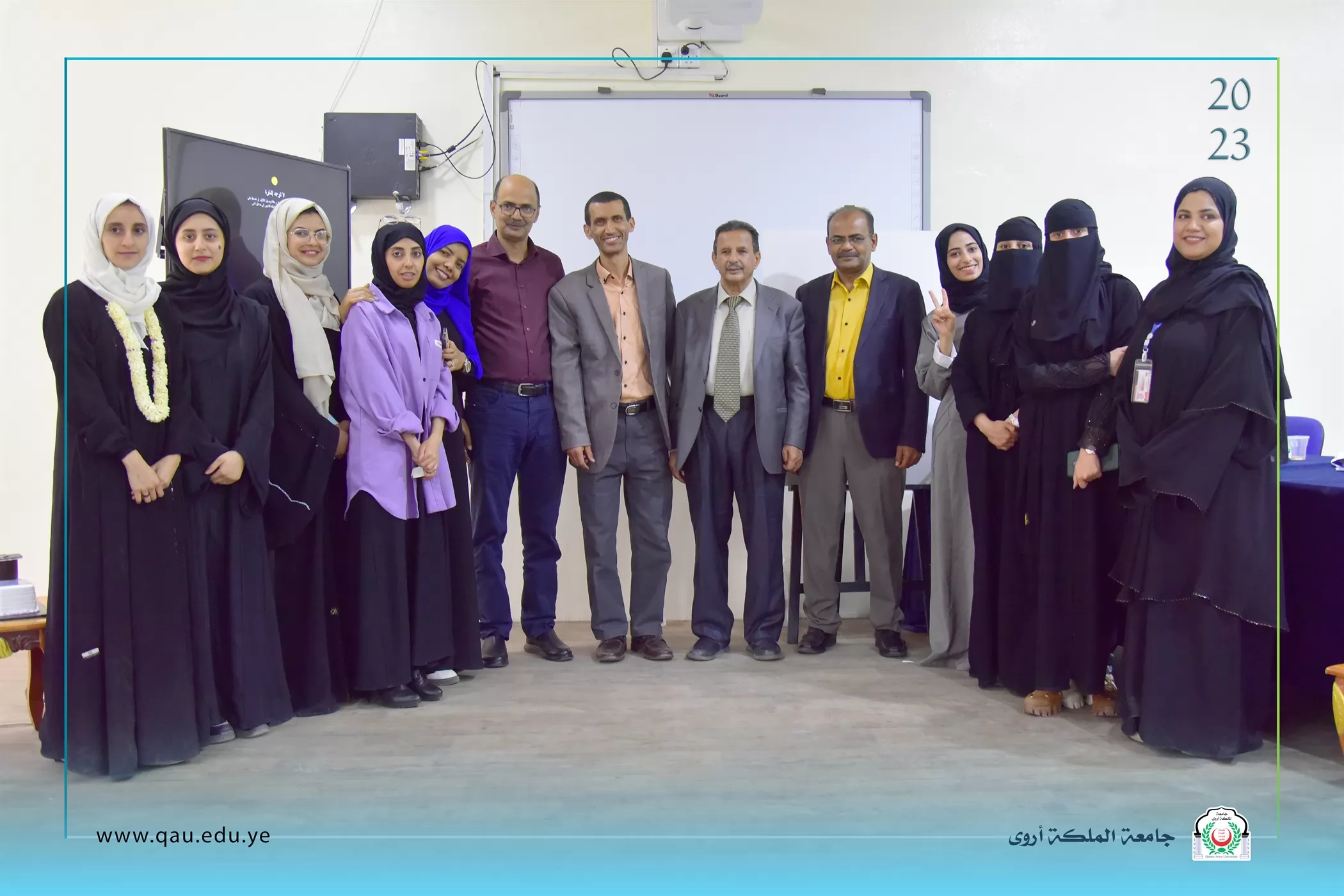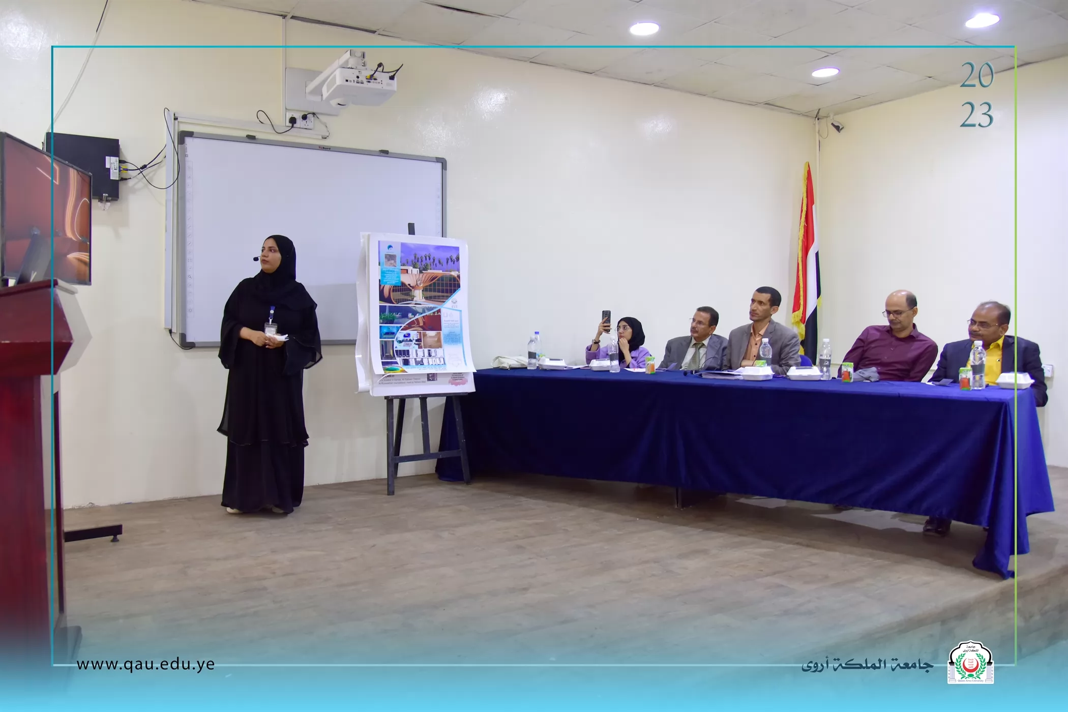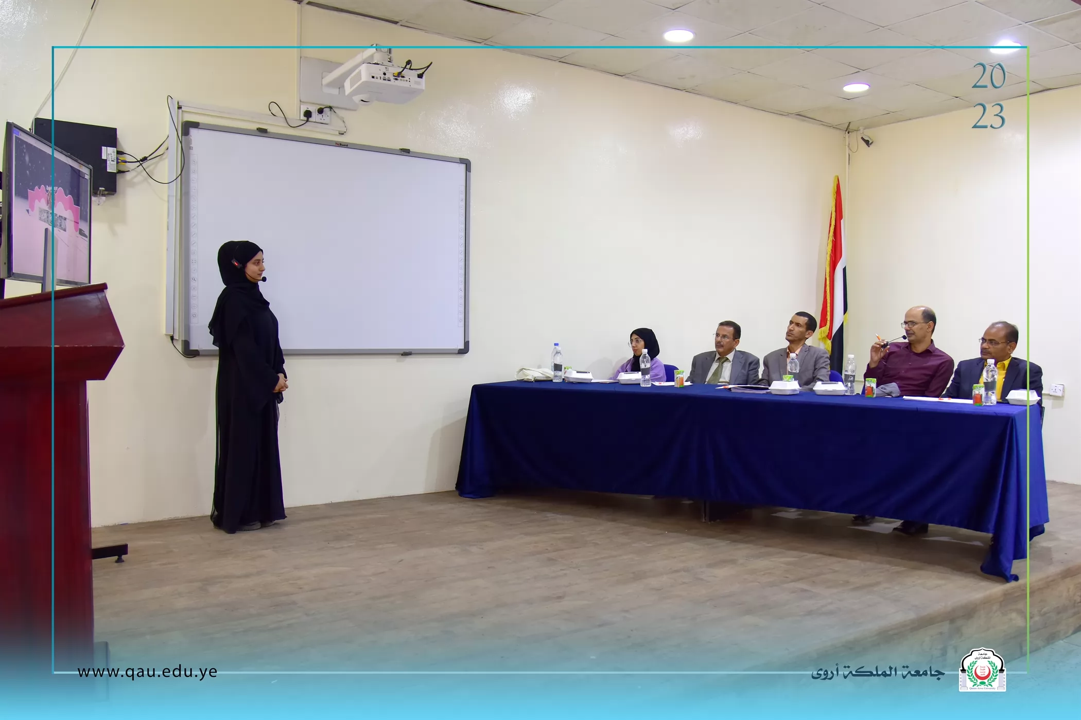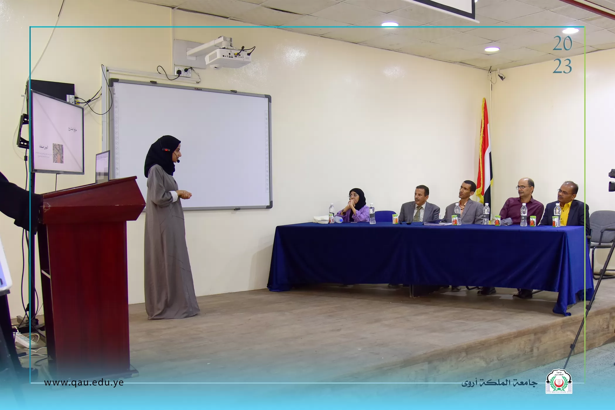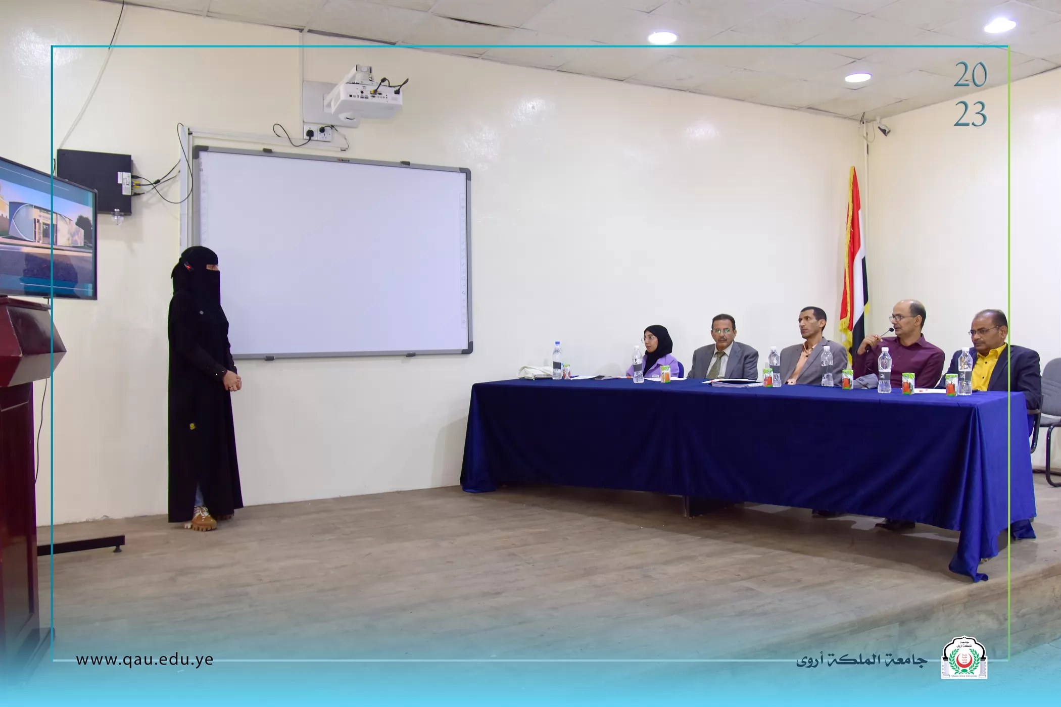 عُقدت بالقاعة الكبرى بجامعة الملكة أروى، جلسة مناقشة مشاريع تخرج طلبة المستوى الرابع قسم الفنون الجميلة/تصميم داخلي، وذلك بحضور الدكتور/ عبد الملك سيف الصلوي - عميد الكلية، وقد تكونت لجنة المناقشة والتحكيم من الأخوة الآتية أسمائهم: